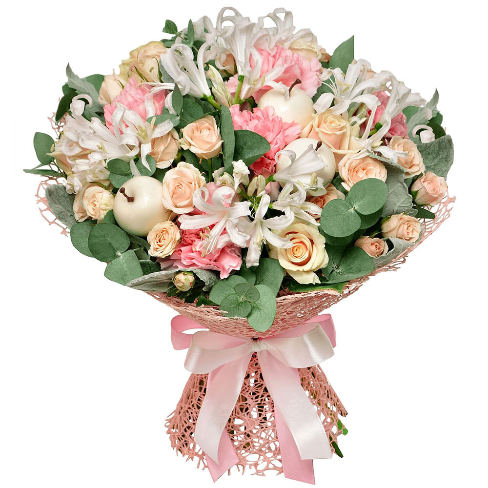 Роза кустовая, роза одноголовая, гвоздика, эвкалипт, альстромерия, декоративный дополнения.